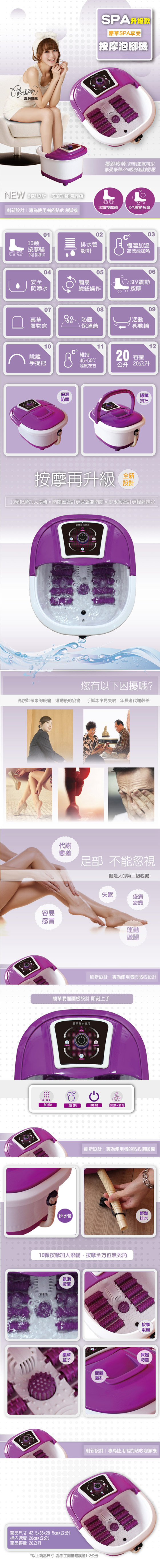 商品說明【健身大師】大容量保溫蓋生及排水管特仕版足療機(泡腳機/足療機/腳底按摩)顏色:高貴紫/時尚黑材質:塑膠(ABS)+馬達電壓:110V/60HZ功率:500W實體長寬高:42.5 x 36 x 28.5 (cm)單個毛重:2.8KG配件:說明書含保證書*1保固:一年電檢字號:R35743 ※注意:泡腳機屬個人衛生用品,只可注入清水試用,並且使用完畢,請務必將桶深內部擦拭乾淨(由本司拍照判定),請勿使用精油、牛奶、沐浴鹽(精)…等非清水注入桶身或者相關會溶解的泡腳材料如藥草,將會造成桶身汙染,並無法復原。若無法遵造以上規定,請勿試用否則將影響您的退貨權利。※溫馨小叮嚀 泡腳機使用重要須知:1.泡腳機加熱在冬天特別寒冷、寒流來襲時,加熱時間會比一般常溫情況下延長屬於正常的現象2.絕對嚴格禁止無水乾燒,使用完畢,務必將電源插頭拔離,否則使用不當會引起嚴重火災等意外,恕不提供保固以及一切責任。 ※商品圖檔顏色因電腦螢幕設定差異會略有不同,以實際商品顏色為準。